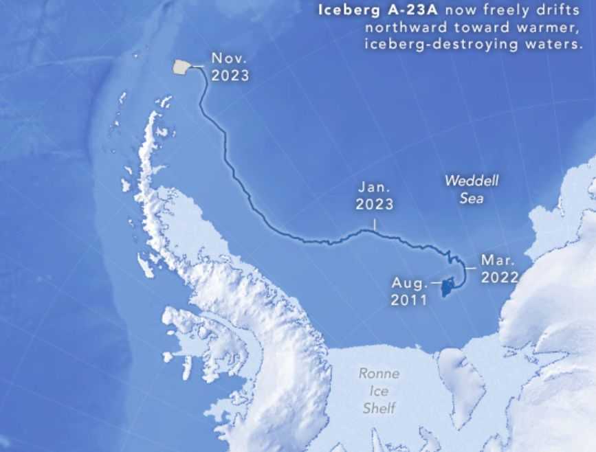 A mintegy négyezer négyzetkilométer területű A23a 1986-ban szakadt le a fehér kontinensről, de csak pár hónapja mozdult meg, és kezdett elsodródni a Weddell-tengeren a partvidéktől. A jéghegy jelenleg az Antarktisz sarki áramlatain sodródik, amely az óra járásával egy irányban forog az Antarktisz körül.