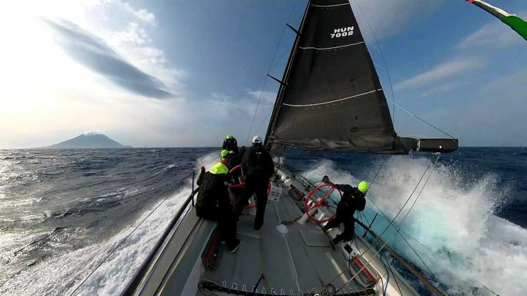 A hangulaton jócskán javított, hogy a hajó itt már állandó 20 csomó feletti sebességgel siklott, spriccelt, fröcskölt minden irányba, így pattogtunk a hullámokon, egészen a füstölgő vulkánszigetig. Strombolicchio, a kis magmamaradvány szirtje után tisztán bő szeles szakasz következett, egészen más taktikával, amibe bele kellett kalkulálni a szélfordulókat, a változásokat, és nagyobb súlyt kapott az előrejelzés, a helyi adatok elemzése, valamint ellenfeleink pozíciója a nyomvonal újratervezésénél.