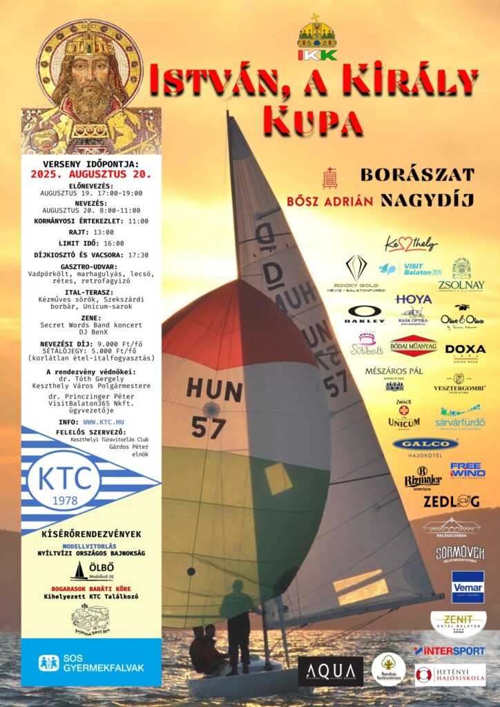 A versenyen az indulók az idén a szekszárdi Bősz Adrián Borászat nagydíjáért küzdenek az abszolút első helyért. Nevezni a verseny előtti napon és a verseny délelőtti óráiban lehet majd. Az István, a Király Kupa a Mészáros Pál Borászat Nagydíjáért 13 órakor startol, és érdemes annak is figyelemmel kísérnie a versenyt, aki csak gyönyörködni szeretne az északi partot is érintő vitorlásokban, hiszen ennyi hajót egyszerre ritkán lehet látni a Keszthelyi-öbölben.