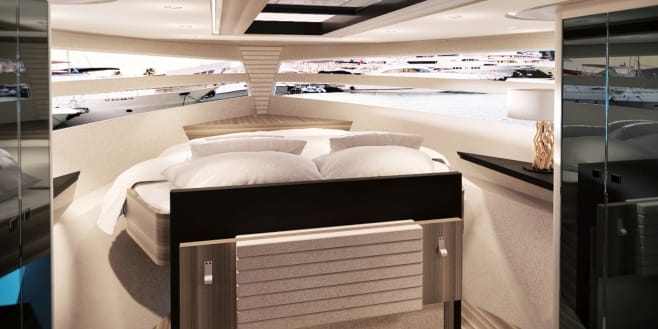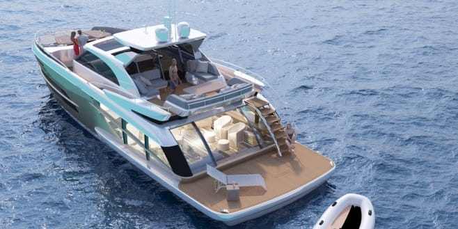 A Van der Valk BeachClub 600 egyelőre csak a tervezőasztalon létezik, de a koncepció nagyon érdekes, ugyanis a motorokat a fürdőplatformba rejtik, így a hatvanlábas motoros élettere lényegesen nagyobb, mint a versenytárs modelleké.
