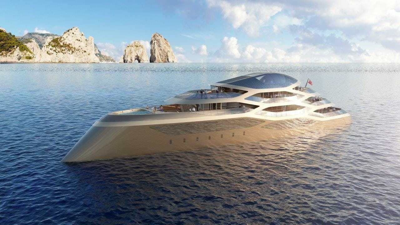 A 77 méteres vízi csoda alsó szintjén vannak a VIP-kabinok, a fő szinten pedig egy medencés élettér kapott helyet, továbbá egy óriási nappali-tárgyaló 270 fokos panorámaablakokkal.