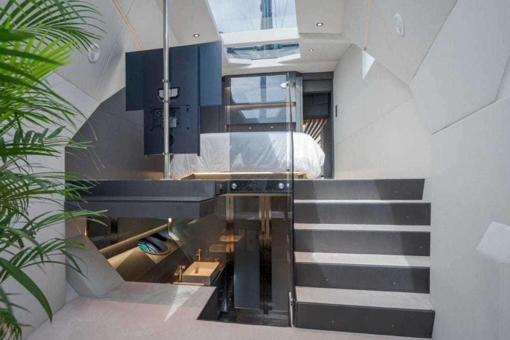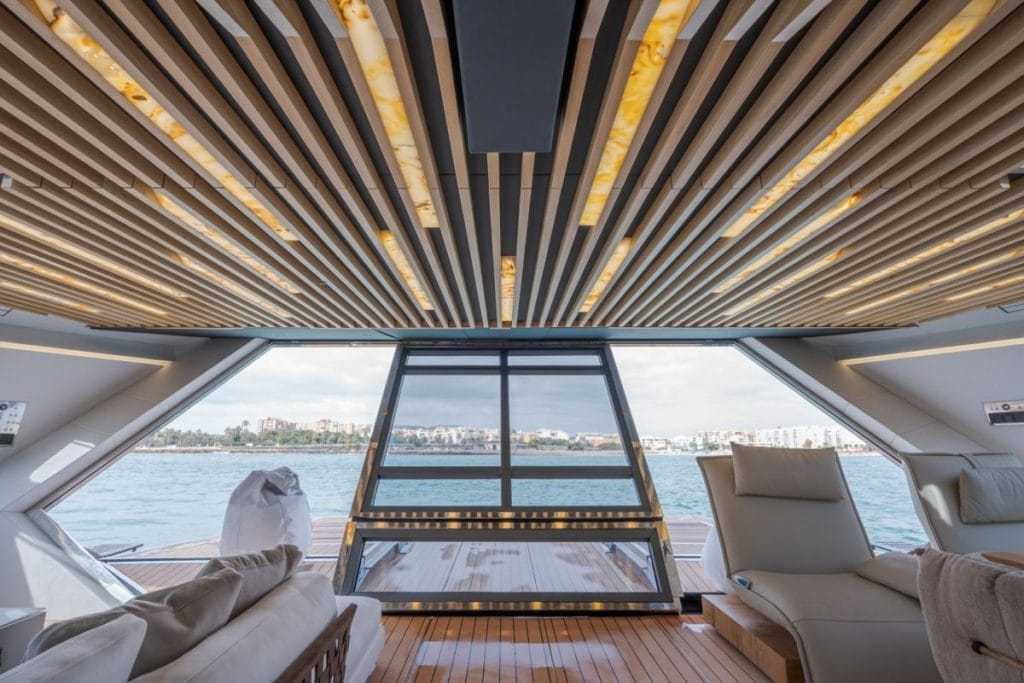 A sportülésekkel kiegészített kormányállásra leginkább a pilótafülke kifejezés illik, a tetőről elegáns, rozsdamentes acél korlátokkal szegélyezett, tíkfával burkolt járófelület vezet le a hajóorrba – bár oda nem nagyon van miért kimászni: „A hajót úgy terveztük, hogy minél kevesebb ok legyen az orrba menni. minden elektronikusan működik.”