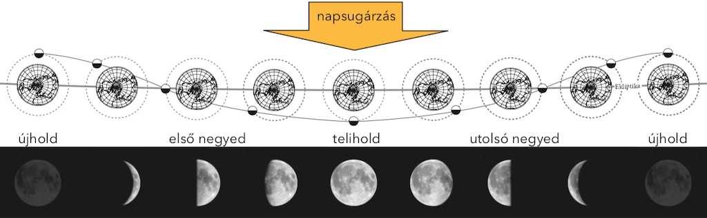 A Hold a Nap fényét veri vissza, de Föld körüli keringése során a megvilágítása állandóan változik a Nap–Föld–Hold-rendszerben elfoglalt helyének folyamatos változása miatt. A holdpálya kis szögben (5°-ban eltérő síkban) hajlik az ekliptikához, ez az oka, hogy telihold idején, amikor a Föld a Hold és a Nap között áll, csak ritka esetben vet árnyékot a Holdra, vagyis csak ritkán van holdfogyatkozás.