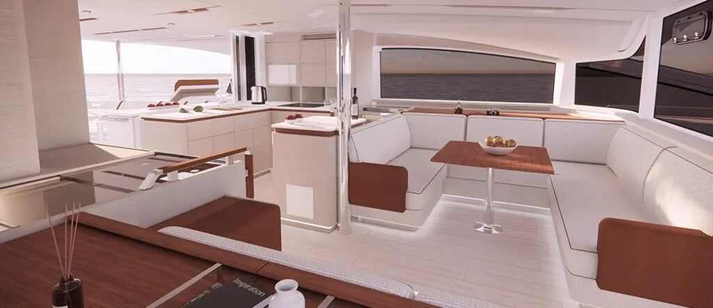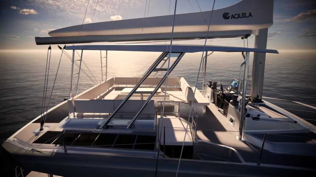 Az étkezőrészen a belső és külső teret bárpult köti össze, gigantikus hűtőszekrénnyel, ugyanitt van külön kijárat az orrkokpitba és navigációs állomás is. 14,97 méteres hosszával, 7,86 méteres szélességével és körülbelül 19 tonnás vízkiszorításával az Aquila 50 a katamarán-piac kellős közepébe pozícionálja magát, vitorlarendszerét úgy tervezték meg, hogy a lehető legjobb teljesítményt nyújtsa – szélsőségek nélkül: „Nem versenykatamaránt akartunk építeni, célunk a gyors, biztonságos és kényelmes vitorlázás. Ezért nem építettünk be sverteket, olyan terméket igyekeztünk létrehozni, amely családok és bérhajós flották számára is megfelelő.”