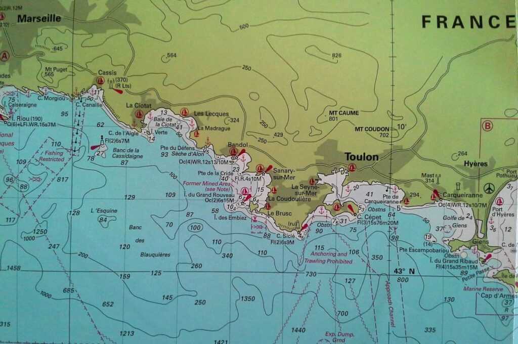 Nyugatra, a Toulon utáni Marseille-ig tartó Cote d’Azur-szakaszon fjordszerű öblök kínálnak szépséges horgonyzóhelyeket a térség nevéhez méltó tiszta, kék vízzel. A Cassis utáni és Marseille előtti Nemzeti Parkban kedvünkre horgonyozhatunk. Az itt fekvő szigetcsoportban rejlik If-sziget, rajta a híres börtönerőd. Ha városi kikötésre vágyunk, Toulon, Embiez-sziget, Bandol, La Ciotat, Cassis, Marseille jachtkikötőjéből válogathatunk. Ekkor 60 mérföldre távolodunk el az indulási kikötőnktől. Tovább hajózva nyugatra érinthetjük a Rhone deltáját és akár eljuthatunk a spanyol Costa Bravára is. A Baleár-szigetek közül Menorcát 220 mérföldnyi nyílt tengeri hajózás után érhetnénk el.