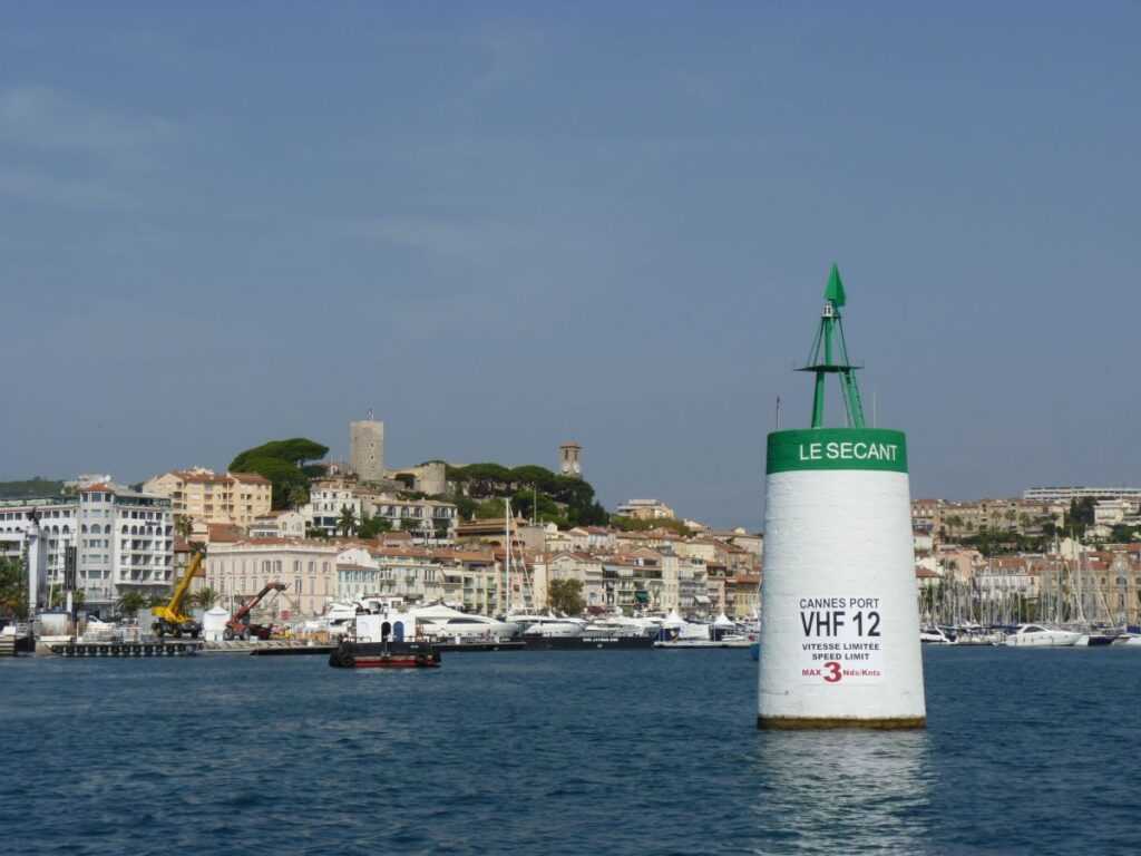 4 mérföld széles homokos strandöböl északkeleti felén található Cannes városa. A mediterrán francia marinákban (Korzikán is) a VHF 09-es csatornán kell forgalmazni a kedvtelési célú hajóknak. Ha nem várnak, a marinai várakozó mólóra (quai d’acceuil) vagy a benzinkúthoz kell kötnünk, míg helyet kapunk. A cannes-i jachtkikötő (Port Vieux) óriási, de estére ez is megtelik. A 724 hajóhelyből 252 jut az idelátogató hajósoknak.