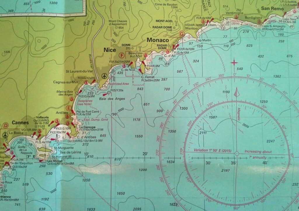 A Földközi-tenger francia vidékén jellemző széljárás a száraz nyári hónapokban nyugatias, májustól szeptemberig 2–6 Bft. erősségű a szél (Misztrál a neve). A nappali szél estére elül, a horgonyzóhelyeken nyugodt éjszakát tölthetünk. Toulon városánál található az Hyéres-félsziget, 5 mérföld mélyen nyúlik be a Földközi-tengerbe. Szélfogóként működik, tőle keletre 2 Beaufort-ral is kisebb a Misztrál ereje, ha fúj. A nyári főszezonban kisszeles, hullámmentes a Riviéra vízterülete, nem véletlen, hogy a Cote d’Azur azúrkék vizein rengeteg a motoros jacht. Délután legfeljebb 3-as szélerővel fúj némi délies irányú vízi szél. Antibes félszigete a másik kiszögellés, utána kevésbé tagolt a partvonal, egymást érik az óriás homokos strandöblök a francia–olasz határig. Földrajzi adottságainak köszönhetően a tenger víz alatti és víz feletti élővilága is gyér Franciaország földközi partvidékén. Ennek az egyik oka, hogy nincs árapályszint-változás, a térségben túl nagy múltra tekint vissza a halászat, valamint elvárosiasodott a tengerpart.