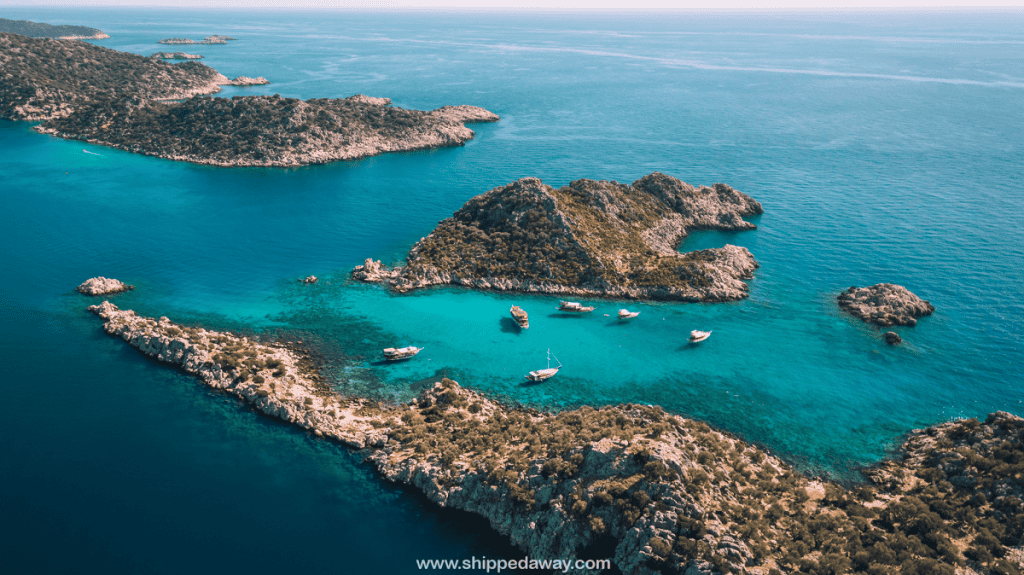 A part mentén 15 mérföld a híres Ekinciki-öböl. Itt a parthoz közel, ötméteres vízben horgonyozhatunk. További 20 tengeri mérföldre érjük el azt a szigetvilágot, amely Göcek városka előtt található. A mély vizű partok mentén egymás után horgonyoznak a hajók, tatjukat hosszú kötelekkel rögzítik a parti sziklákhoz. Kényelmesebb kikötésre Kleopátra öblében lelünk (Romok-öble), az éttermes famólóval várja a hajósokat Nála ebédelünk, és így a kikötés ingyenes.