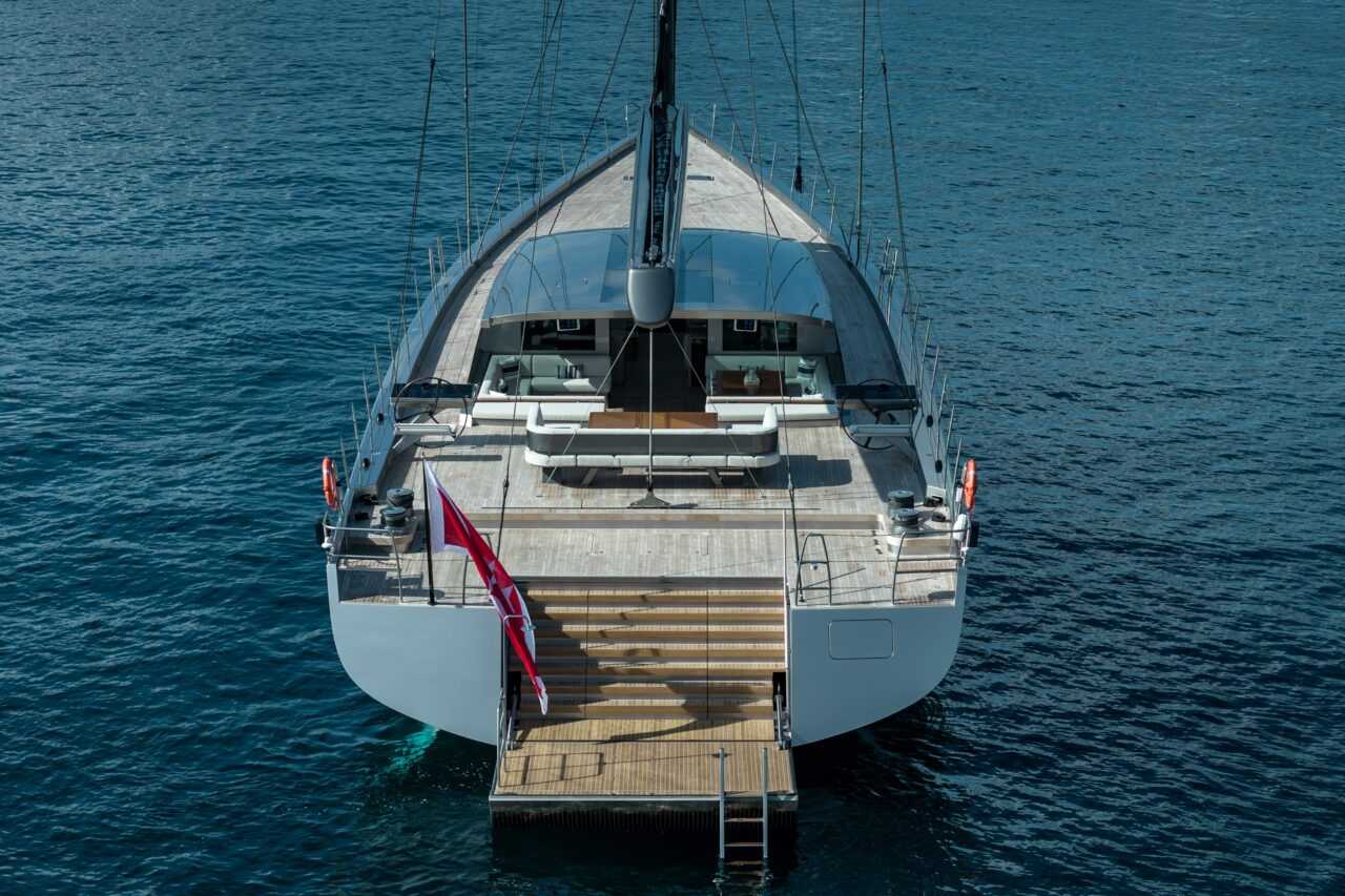 A tatból lenyitható beachplatform a víz szintjén kínál közvetlen kapcsolatot a tengerrel. Ez a rész nemcsak úszásra és vízi sporteszközök használatára alkalmas, hanem önálló pihenőtér is: napozásra, esti lazulásra vagy egyszerűen a víz közelségének élvezetére. A három kültéri terület együtt egy jól átgondolt, többfunkciós outdoor életteret alkot, amely a modern szuperjachtoktól elvárt szabadtéri komfortot és térérzetet magas szinten biztosítja.