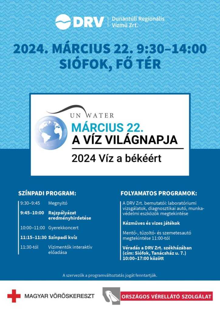 A Dunántúli Regionális Vízmű Zrt. idén is nagyszabású rendezvénnyel vár minden érdeklődőt Siófok Fő terén a Víz világnapján, március 22-én.