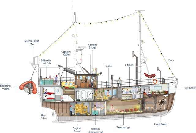 Hét kabin található a hajón, így hosszabb utazásokra is kibérelhető. Négy-öt fős személyzettel működik, és természetesen egy séf felel azért, hogy tengeri ínyencségek kerüljenek az asztalra – írta a travelo.hu.