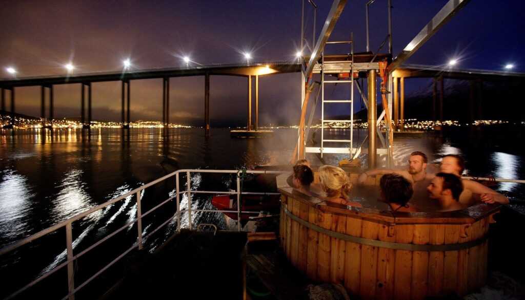 A kádban negyven fok körüli hőmérsékletre felmelegített tengervíz van, ami nagyon jól jön, miközben a sarki szél az arcunkba vág. Az egykori bálnahús-feldolgozó szinten most egy zen lounge található, és az óránkénti húszdolláros jegyért meleg welcome drinket is kapunk a fedélzetre lépve.