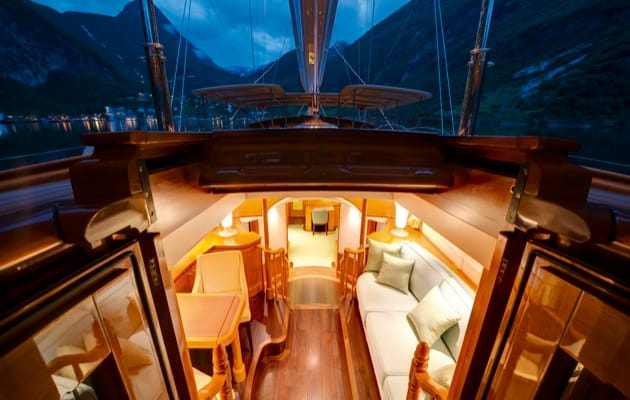 Amikor megpillantjuk a szuperjachtot, az első dolog, ami szemet szúr, az a hatalmasnak tűnő tér. A látvány zavartalan, a padlótól egészen a teak fedélzetik. A belső rész kimondottan otthonos, a privát kabinok és a közösségi terek szinte összeolvadnak. A könnyű tölgyburkolat kellemes mézárnyalatúvá színezi a belsőt.