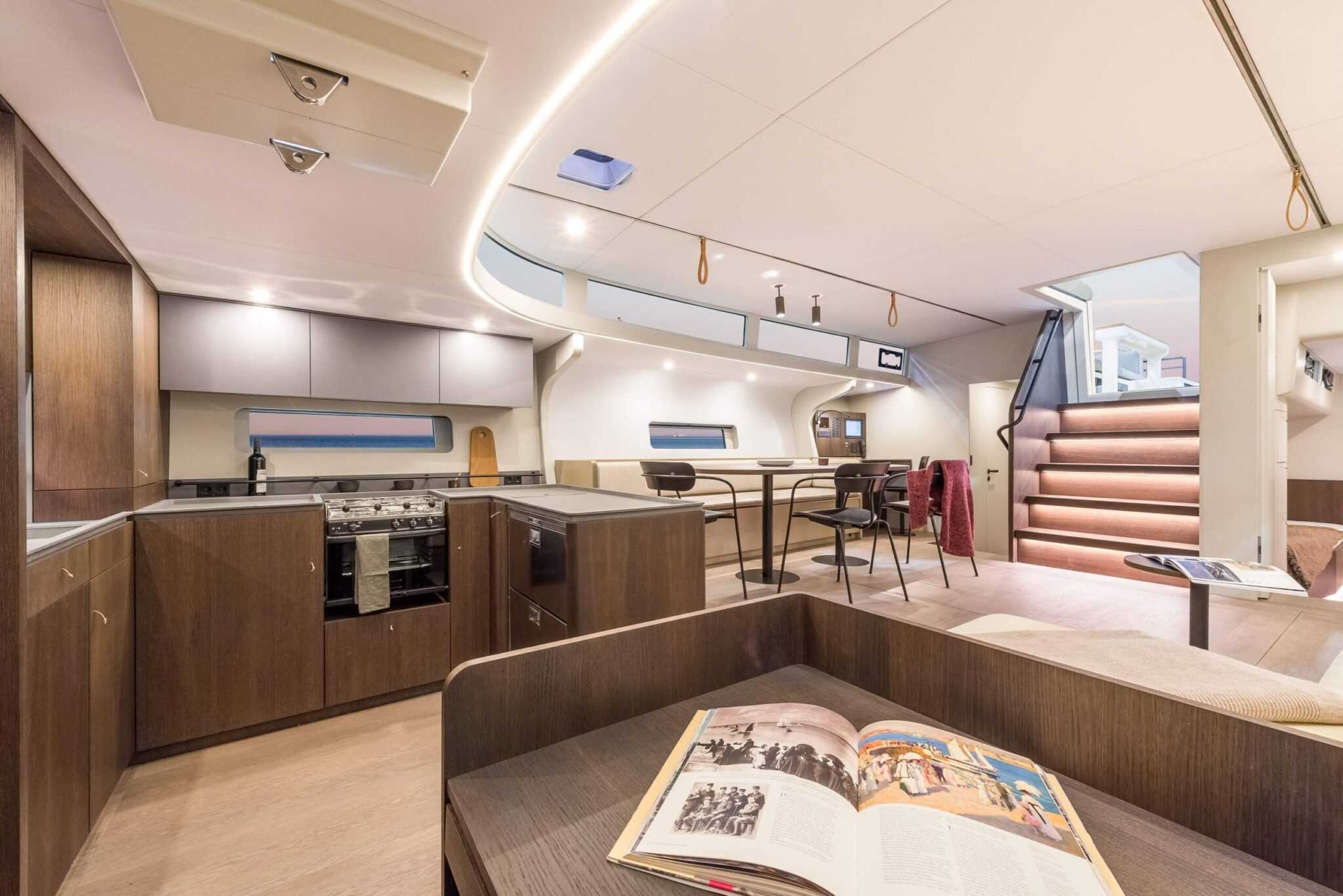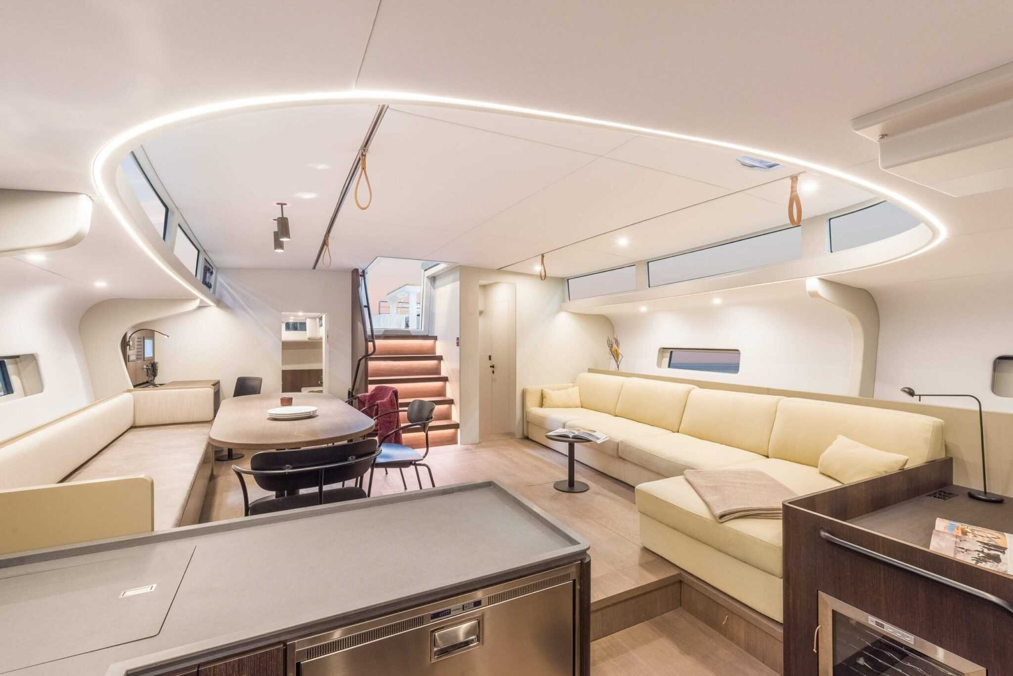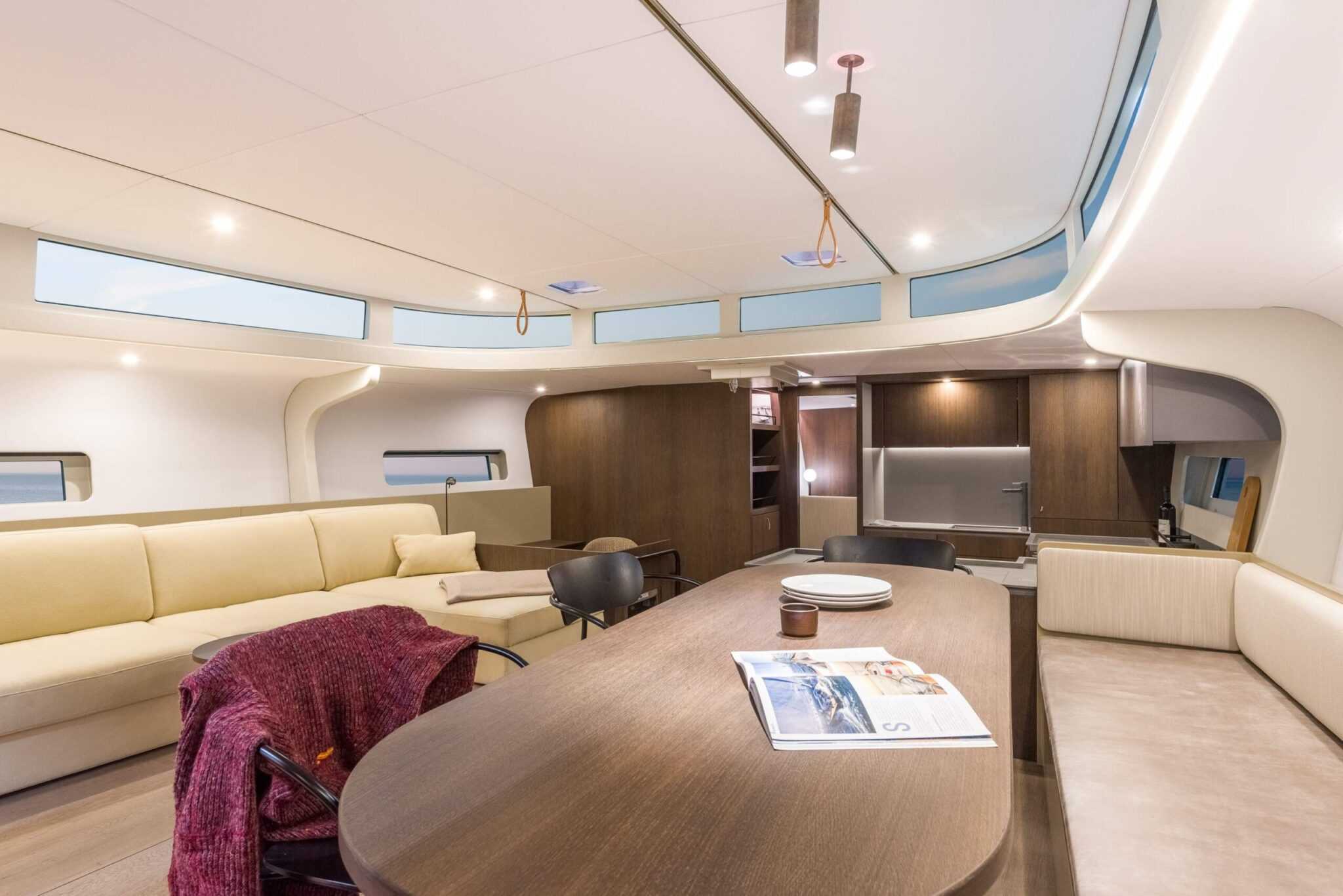 A belső elrendezés moduláris, így bőséges választási lehetőséget kínál a tulajdonosnak. Három vagy négy kabin, dupla vagy szimpla ágyak, a konyha pedig lehet akár középen, akár hátul a legénységi szállás mellett.