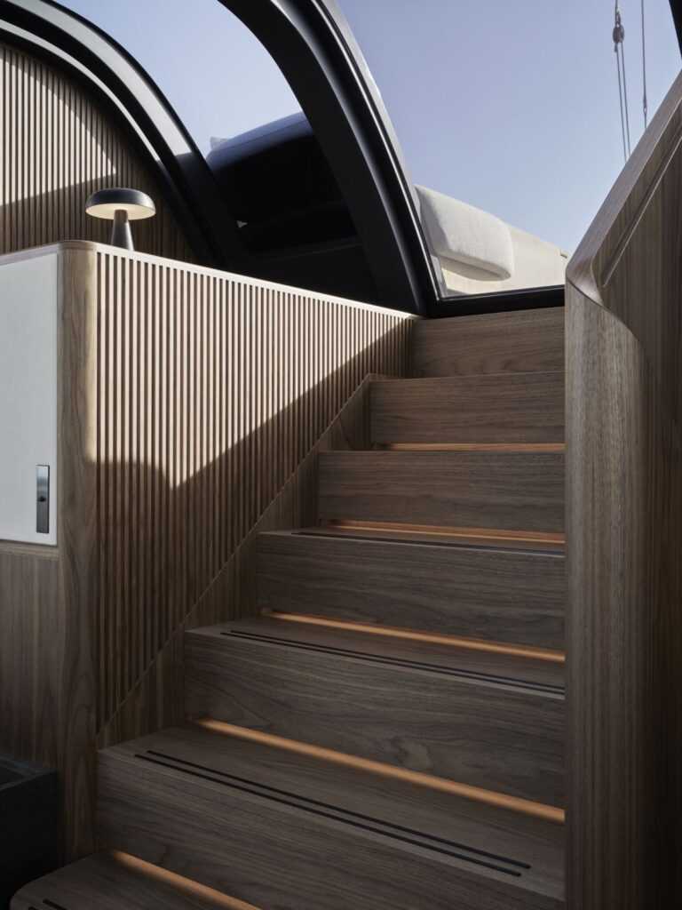 A jacht kifinomult belső tereit a többszörös díjnyertes svéd építész Andreas Martin-Löf tervezte. A minimalista svéd stílust ötvözte fenntartható megoldásokkal és anyagválasztással, illetve a részletek olyan kidolgozásával, amivel melegséget és komfortot csempészett a lakóterekbe. A világos felületek kontrasztjául a sötét amerikai diófelületek szolgálnak. A fapanelek a sportos jachtokhoz hasonlóan – ahol fontos a súlycsökkentés – nem tömör fából készültek, hanem ultrakönnyű méhsejtes paneleket vontak be furnérlemezzel. Ugyanezzel a megoldással készültek a fürdőszobák kőfelületei, itt vékonyra munkált mészkőlemezekkel vonták be a méhsejt paneleket.